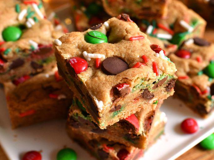 These festive Christmas cookie bars are like a holiday chocolate chip cookie in bar form. They come together quickly—using just one bowl—and they don’t require an electric mixer. Just mix up the dough, bake, and you’ll be enjoying a delicious Christmas-y treat in no time!
