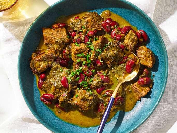 Ghormeh sabzi is deliciously savory and loaded with the flavors of several different green herbs. It’s traditionally served atop white rice (polow). You can also serve it with lavash bread.