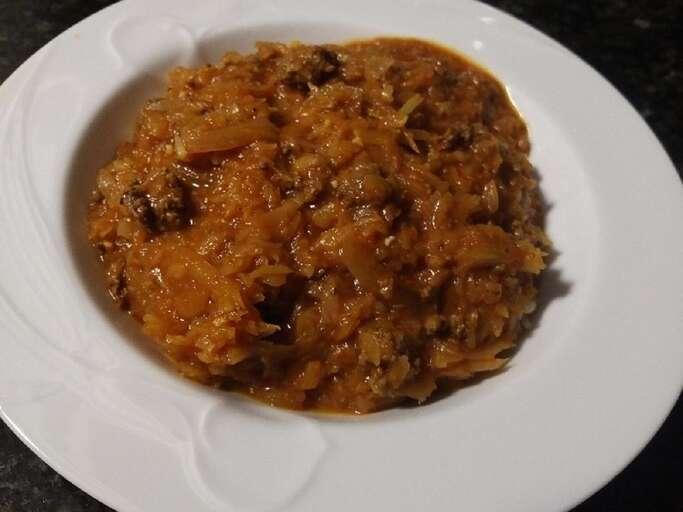 2. Transfer beef mixture to a slow cooker. Stir in water, cabbage, tomato purée, condensed soup, rice, bouillon, salt, and pepper. Cover and cook on High for 8 hours.