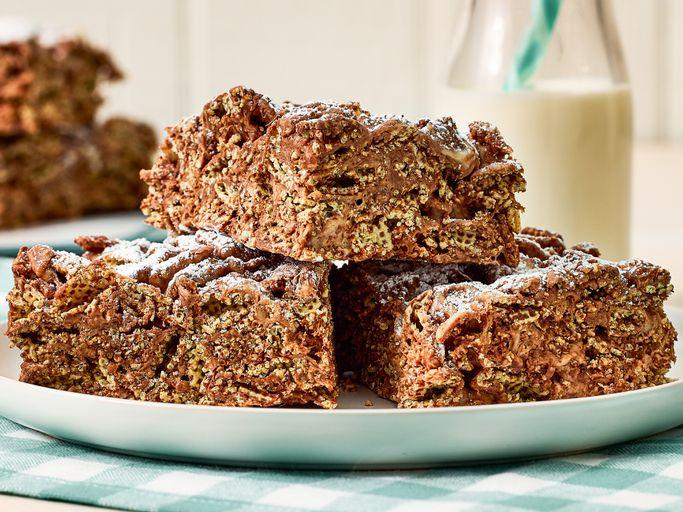 7. Sift remaining 1 tablespoon powdered sugar over cereal mixture, cut into 12 (3-x-3.25- inch) pieces and serve.